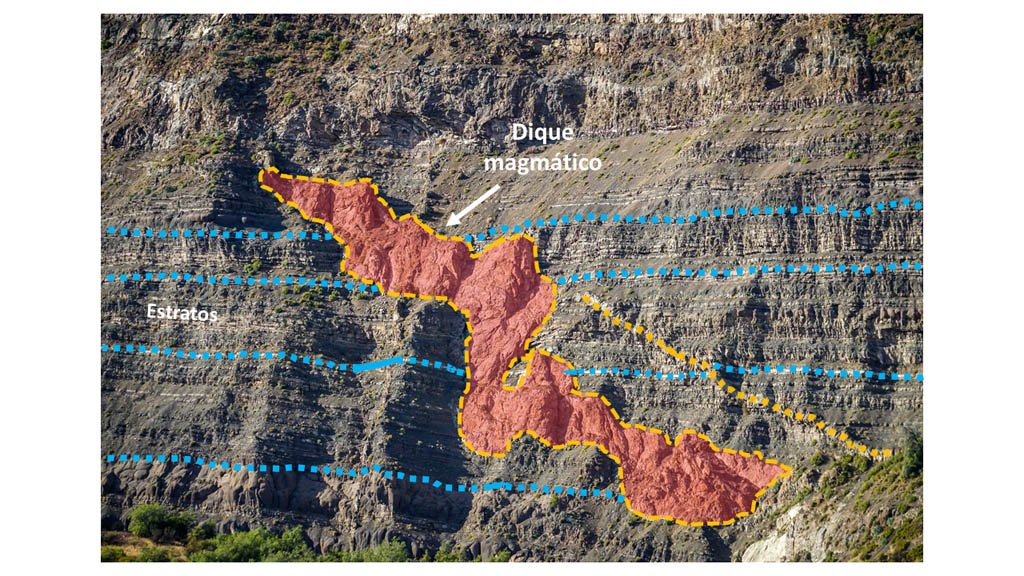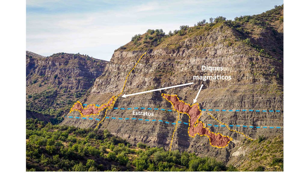 La secuencia es atravesada por masas de roca de color claro llamadas diques, cuyas formas irregulares interrumpen la armonía de las capas alineadas. Estos diques son vestigios de las raíces de antiguos volcanes, ya que se formaron por el enfriamiento del magma en las profundidades: la masa de roca fundida que los alimentaba hace millones de años.
