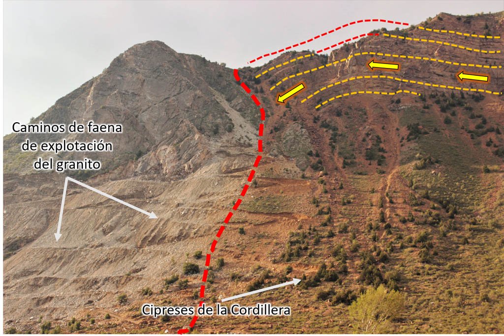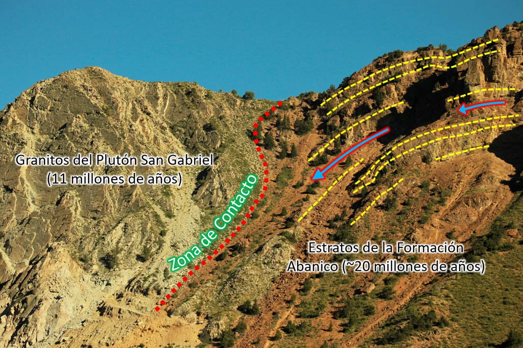 Este geositio permite observar y entender un proceso geológico ocurrido hace millones de años y a varios kilómetros de profundidad. Aquí se observa una clara zona de contacto entre dos conjuntos rocosos muy diferentes: La masa de roca blanquecina de la izquierda es parte del Plutón San Gabriel, un extenso conjunto de rocas, originadas hace más de diez millones de años por el enfriamiento de una enorme cámara magmática a varios kilómetros de profundidad, una gran masa de roca fundida que alimentaba a los volcanes de la época, y que alcanzaba unos 900°C de temperatura. A la derecha, en color anaranjado se ven capas de roca de la Formación Abanico, que han sido depositadas por erupciones volcánicas y antiguos ríos hace más de 20 millones de años. Este contacto se originó cuando la masa de magma que conformaba al Plutón San Gabriel se emplazó en contacto con la Formación Abanico. Esto generó que sus rocas se calentaran demasiado y tomaran su color anaranjado. |