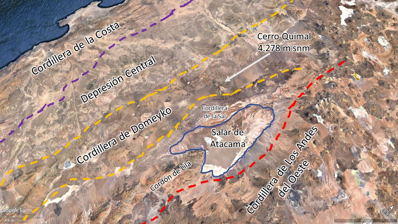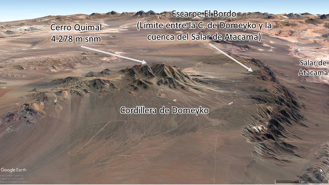 Esta cordillera está formada por rocas mucho más antiguas que las de la Cordillera de los Andes, alcanzando incluso la edad Paleozoica, lo que significa que tienen más de 250 millones de años. Las capas de roca que la conforman son de origen volcánico, producto de antiguas erupciones que ocurrían en el lugar. Luego de su formación, las fuerzas de las placas tectónicas han deformado y levantado esta cordillera, principalmente a través del movimiento de grandes fallas geológicas. El cerro Quimal es la mayor cumbre de la cordillera de Domeyko, alcanzando los 4278 msnm, y es lo que se conoce en geología como “un “Plutón. Esto es una antigua cámara magmática, que tiene menos de 100 millones de años, que alimentaba antiguos volcanes de la zona, y que se enfrió, convirtiéndose en rocas conocidas como gabros. La gran mayoría de los grandes yacimientos de cobre del norte de Chile, siendo de los más grandes del mundo, están asociados a esta cordillera, como son La Escondida, El Salvador o Chuquicamata. |