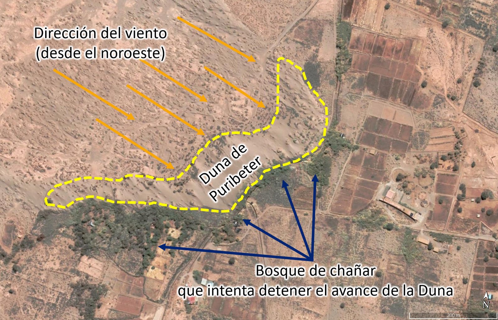 | Descripción geológica | El desierto de Atacama es uno de los lugares más áridos del mundo. Allí destacan algunos de sus parajes que están cubiertos por dunas, que son crestas o montículos producidos por la acumulación de arena. Estos granos de arena han sido transportados y depositados por el viento, por lo que se conocen como depósitos de origen eólico. La arena empieza a acumularse en cualquier lugar en el que una obstrucción situada en el camino del viento ralentice su movimiento.