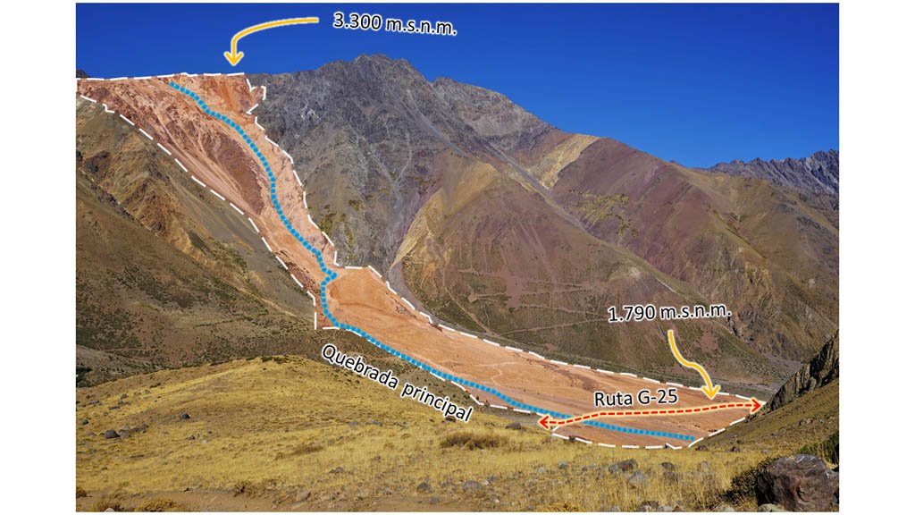 La remoción en masa Las Amarillas se ubica en una quebrada activa que se extiende hasta los 3300 metros en su cumbre, y que se caracteriza por sus depósitos de intenso color amarillo. Las rocas del lugar han pasado por un proceso geológico llamado “alteración hidrotermal”, tras estar en contacto con fluidos calientes y muy cargados de elementos químicos en profundidad, lo que degrada sus minerales y cambia su coloración. Ésta es una quebrada muy abrupta y sus rocas, tras su alteración, se tornan muy frágiles, por lo que aquí suelen ocurrir “remociones en masa”, es decir, violentos movimientos de rocas y otros materiales que son transportados desde las zonas más altas hacia abajo, en general, producto de fuertes lluvias. |