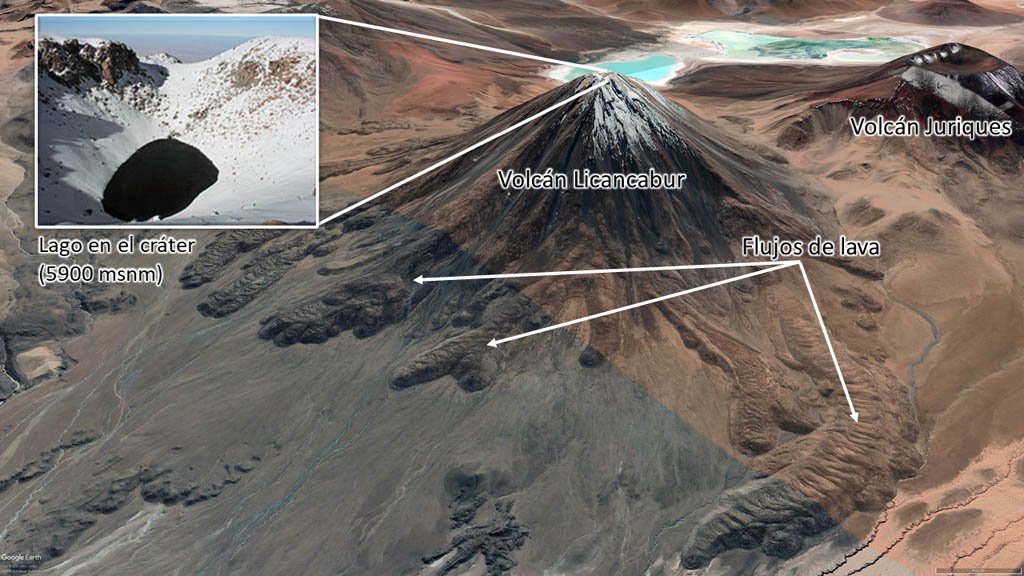 El volcán Licancabur está ubicado en la cordillera de Los Andes. Su cumbre alcanza los 5.916 m.s.n.m., y es un hito de la frontera entre Chile y Bolivia. Tiene forma de cono casi perfecto, y en su cumbre posee un cráter de 500 m de diámetro, que contiene un lago en su interior, uno de los dos más altos del mundo.